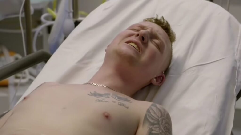 No vídeo, Liam está deitado em uma cama hospitalar, acompanhado do pai e da avó. Ele sente dores intensas no abdômen, respira com dificuldade e apresenta glicemia extremamente elevada. A equipe médica monitora seus sinais vitais e age para estabilizar a situação.