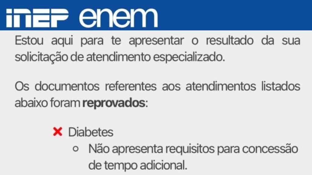 A partir desta situação, procurou sua médica endocrinologista, que fez um novo laudo indicando o Código Internacional de Doença (CID) e também adicionou todas as informações. A reportagem teve acesso aos dois documentos. Porém, o Inep negou o recurso e a jovem perdeu seu direito de atendimento especializado por diabetes no Exame Nacional do Ensino Médio.