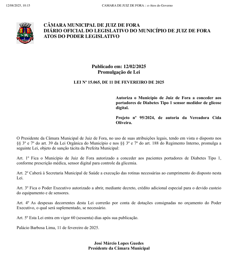 Aprovada pela Câmara Municipal em fevereiro, a Lei nº 15.065/2025 autoriza a Prefeitura de Juiz de Fora (MG) a fornecer sensores digitais de glicose para pessoas com diabetes tipo 1 na rede pública, mediante prescrição médica. O texto entrou em vigor em 12 de abril, 60 dias após sua publicação. No entanto, quase quatro meses depois, o programa não começou.