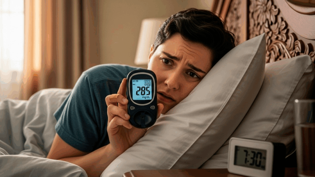 - Efeito Somogyi (hiperglicemia de rebote): Ocorre quando episódios de hipoglicemia noturna, muitas vezes despercebidos, resultam em glicemia alta ao amanhecer. Os sinais podem ser suor noturno, pesadelos ou mal-estar ao acordar.
