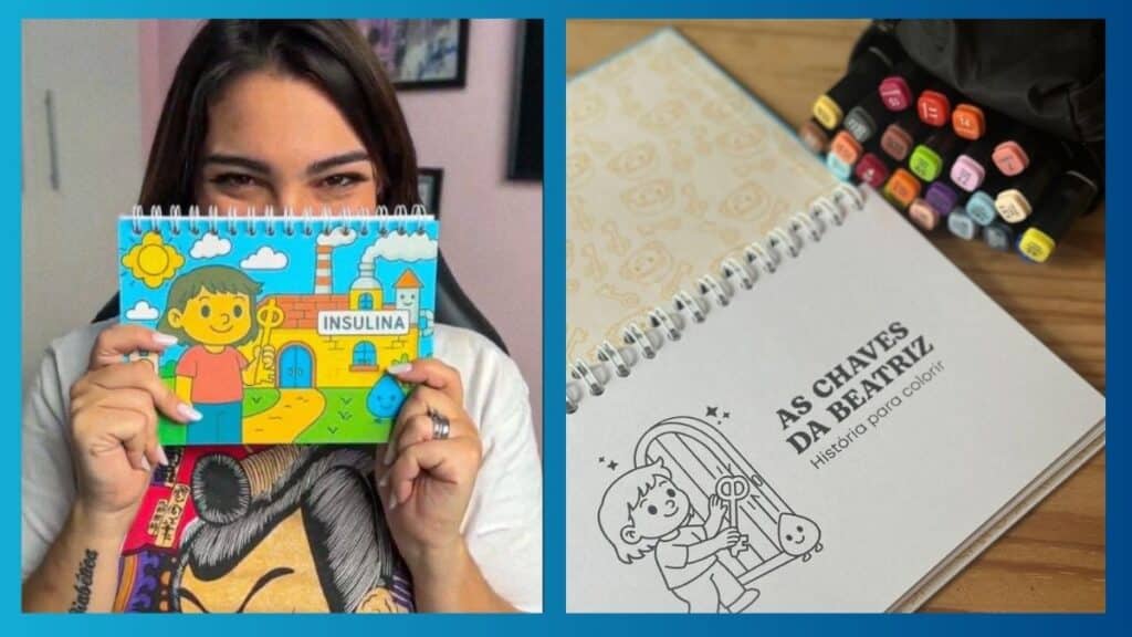 Entre os projetos já realizados, está o livro de pintar “As chaves da Beatriz“, inspirado no gesto de seu pai no dia do diagnóstico. Para que a filha entendesse a condição aos 6 anos, ele desenhou uma fábrica de insulina e os anticorpos que atacavam o pâncreas. Dessa forma, essa forma lúdica de aprender se transformou em um material educativo e terapêutico. O material ajuda crianças a compreenderem o diabetes sem medo e adultos a ressignificarem sua própria relação com a condição.
