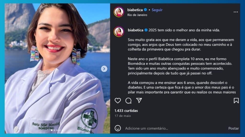 Formada em Relações Públicas desde 2015, Bia decidiu retomar a vida acadêmica para realizar um sonho antigo: ser profissional da saúde. Em 2025, ela conclui a graduação em Biomedicina, fechando um ciclo de 25 anos desde o diagnóstico. A menina que um dia precisou aprender a aplicar insulina agora se prepara para atuar como especialista e multiplicadora de conhecimento científico. De fato, a influenciadora com diabetes realiza sonho de ser profissional de saúde com dedicação.