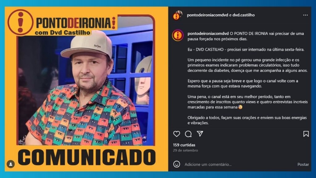 Contudo, por causa do diabetes, “tudo evoluiu muito rápido”. David Castilho, também conhecido como DVD Castilho, tem uma carreira de mais de 15 anos, com passagens também pelo The Noite e Pânico na Band. No dia 29 de setembro, ele comunicou em suas redes a necessidade de uma pausa forçada devido a problemas circulatórios e uma infecção grave.