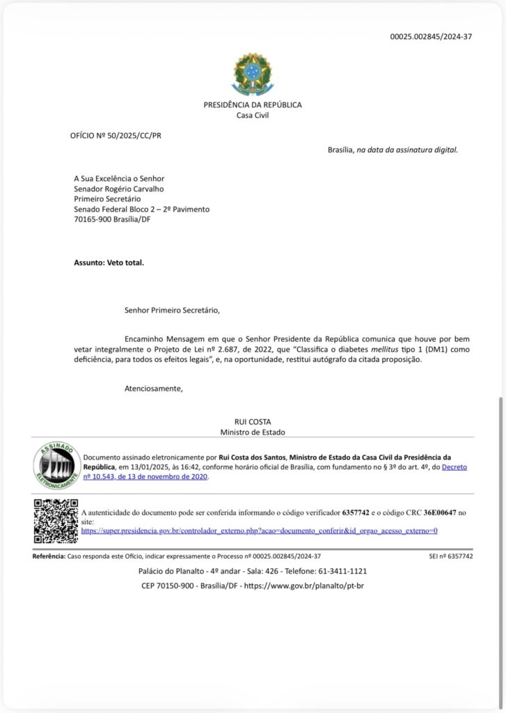 Nove meses após o veto presidencial ao Projeto de Lei 2687/2022, a deputada federal Flávia Morais (PDT-GO), autora da proposta que reconhece o diabetes tipo 1 como deficiência para efeitos legais, solicitou ao Ministério da Previdência Social a elaboração de um estudo de impacto orçamentário e financeiro sobre o tema.