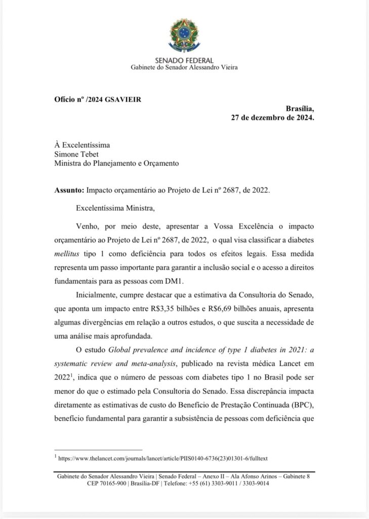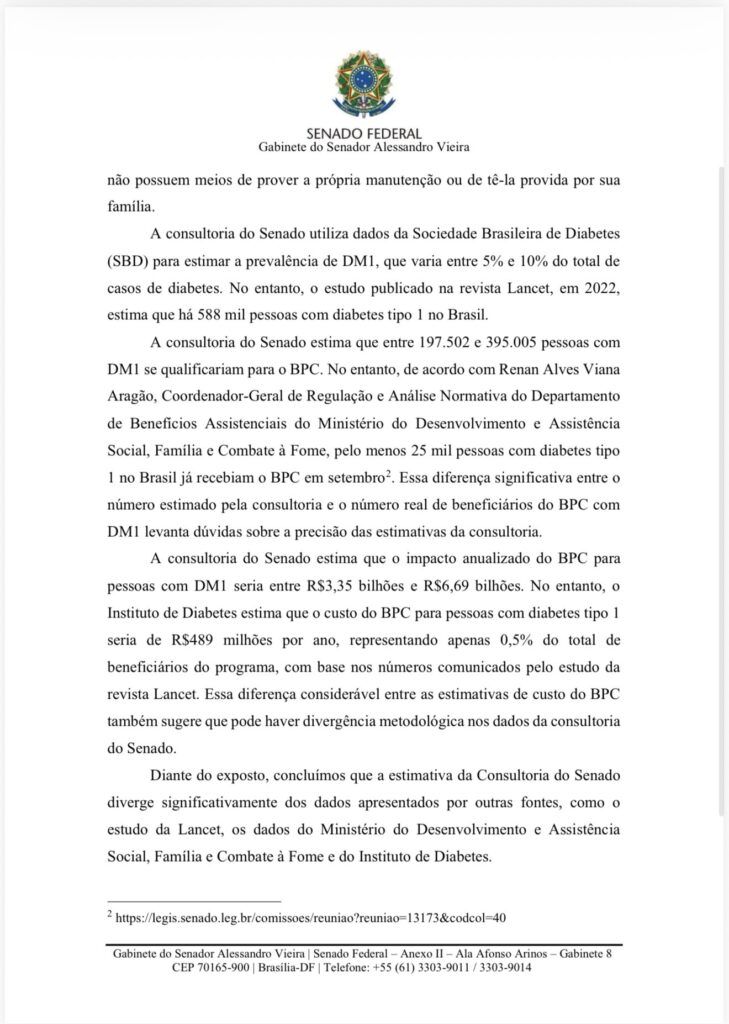 No ofício, o senador cita dados científicos publicados na revista The Lancet (2022) que estimam em aproximadamente 588 mil o número de pessoas com diabetes tipo 1 no Brasil — bem abaixo da base usada pelo Senado — o que reduziria o impacto para menos de R$ 500 milhões anuais. O texto também menciona informações do Ministério do Desenvolvimento e Assistência Social, segundo as quais cerca de 25 mil pessoas com diabetes tipo 1 já recebem o BPC, reforçando que o custo efetivo seria muito menor que o inicialmente projetado.