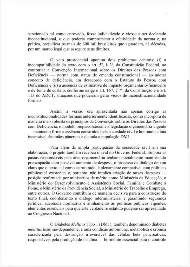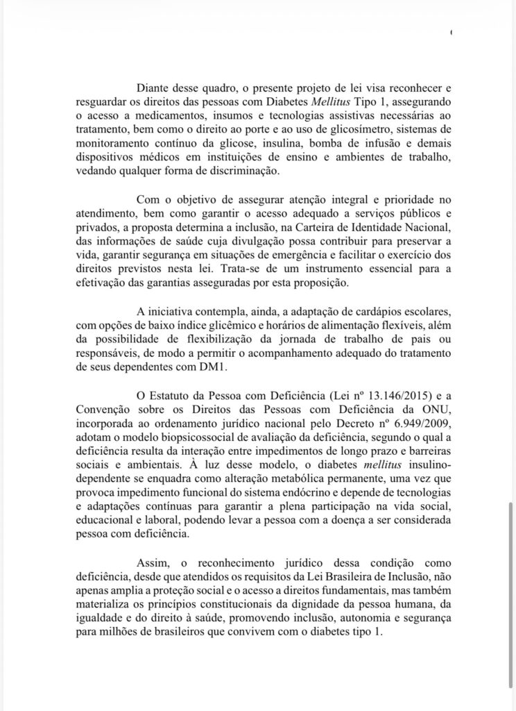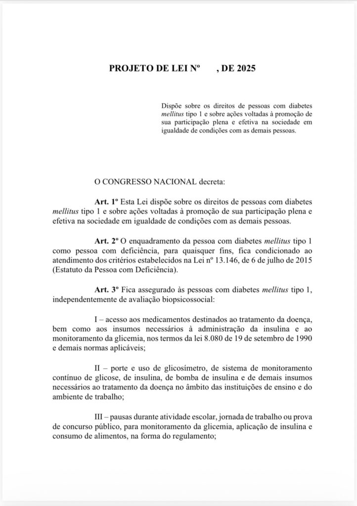 O governo federal apresentou uma nova minuta do projeto de lei que trata do enquadramento do diabetes tipo 1 (DM1)como deficiência conforme os critérios legais vigentes. O texto foi protocolado no Senado no dia 14 de novembro, durante o Dia Mundial do Diabetes, com confirmação do gabinete do senador Randolfe Rodrigues (sem partido-AP).