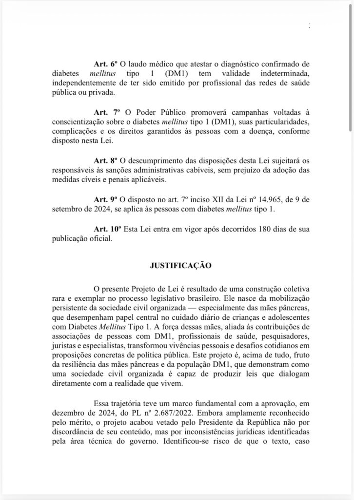 O debate legislativo teve início em 2022, com o PL 2687/2022, aprovado pela Câmara e pelo Senado. O texto previa a classificação automática da pessoa com diabetes tipo 1 como pessoa com deficiência “para todos os efeitos legais”.