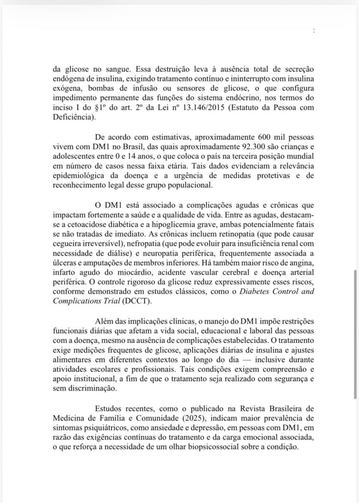 A minuta ressalta que o DM1 é uma condição crônica e irreversível, que pode gerar limitações funcionais a depender das barreiras encontradas no cotidiano.