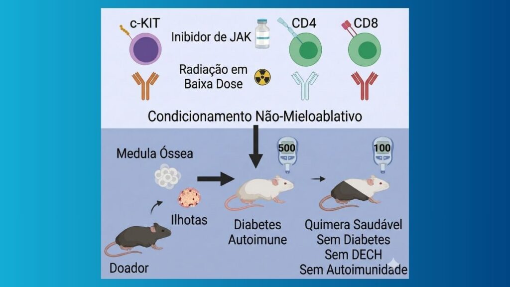 Para alcançar esse estado nos animais, a equipe utilizou um regime de condicionamento mais suave do que a quimioterapia tradicional. O processo envolveu o uso de anticorpos monoclonais (anti-CD117) e baixas doses de radiação. Assim, o corpo do camundongo “aprende” a aceitar as novas células produtoras de insulina, interrompendo o ataque autoimune característico da condição.