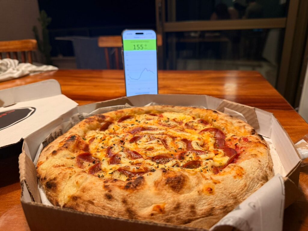 A gordura da pizza retarda a digestão e pode elevar a glicose horas depois da refeição. Enquanto isso, durante o sono, esse aumento pode passar despercebido. Por isso, o acompanhamento glicêmico noturno é especialmente importante após a pizza.