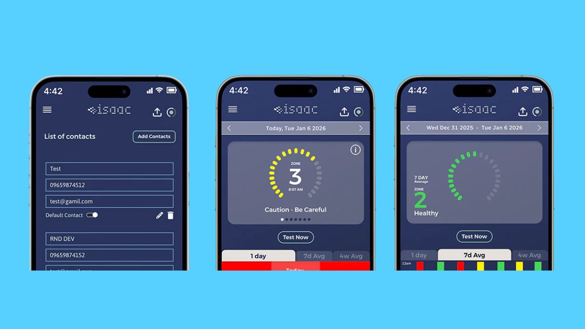 O aplicativo Isaac by PreEvnt, disponível para iOS e Android, funciona como interface de visualização e armazenamento das leituras. Dessa forma, o sistema organiza os resultados dos testes de respiração em histórico e permite exportar relatórios.