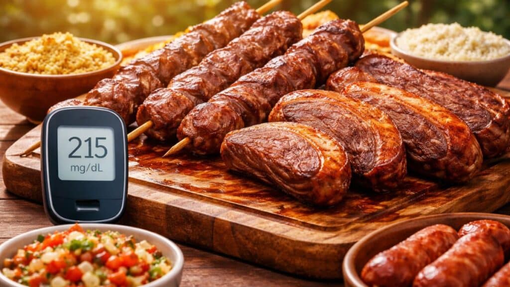 Quando se fala em churrasco, a associação imediata costuma ser com carne. No entanto, a refeição geralmente inclui arroz, farofa, pão e vinagrete. Nesse contexto, o consumo total de carboidratos pode aumentar sem que a pessoa perceba. Além disso, a ingestão elevada de proteína e gordura também influencia a glicose.