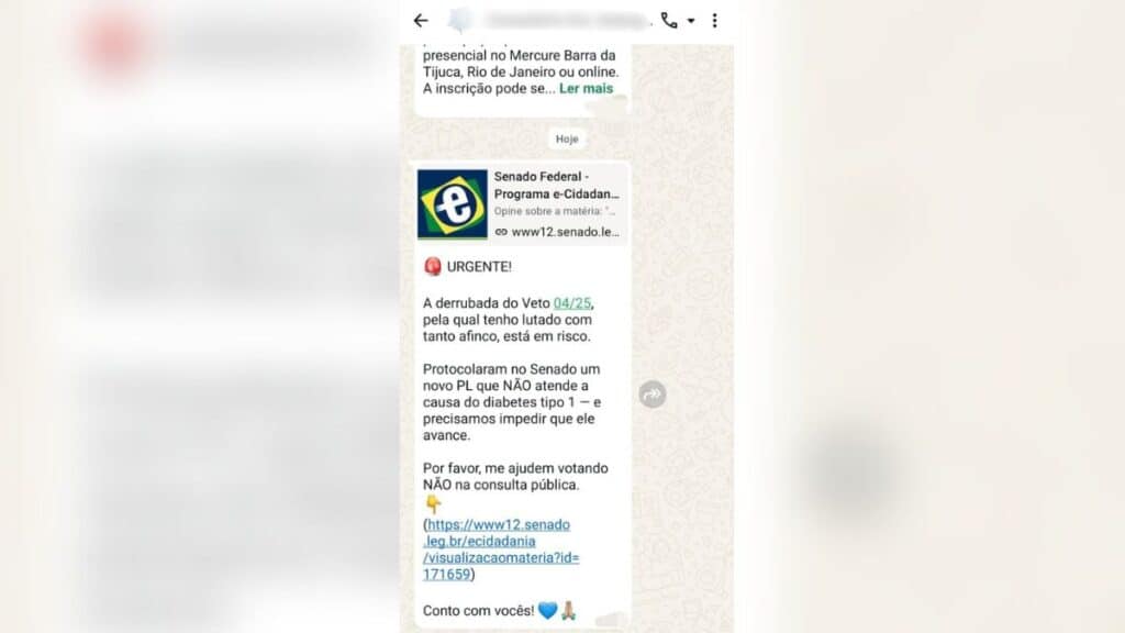 O Portal Um Diabético teve acesso a prints dessas mensagens. Em um caso, o consultório de uma médica ligada à Sociedade Brasileira de Diabetes enviou mensagem a pacientes pedindo voto contrário à nova proposta.