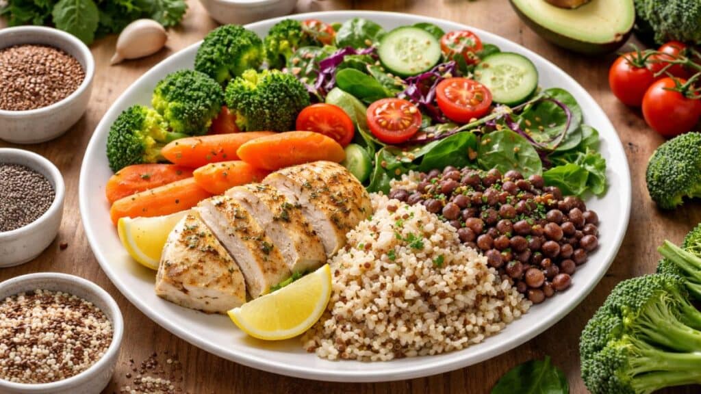 • 25% de proteínas magras: frango, peixe, ovos, tofu ou leguminosas