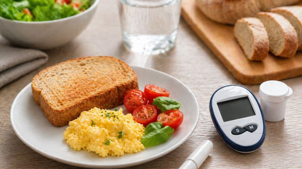 A escolha do acompanhamento altera a resposta glicêmica. O pão com ovo fornece proteína e pode reduzir picos de glicose.